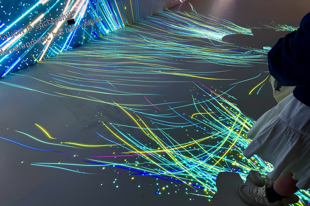 The powerful images and sounds that fill the entire space create a sense of realism, but because the starry sky and blue Earth cover most of the screen, it gives off a similar impression to a planetarium, allowing you to comfortably immerse yourself in the world. Before and after the screening, the light of the stars spread out around your feet interacts with the movements of the audience, flickering in sync with their movements, and during the screening, the audience's movements are reflected on the screen as beams of light, creating a fantastical beauty that is also a highlight.