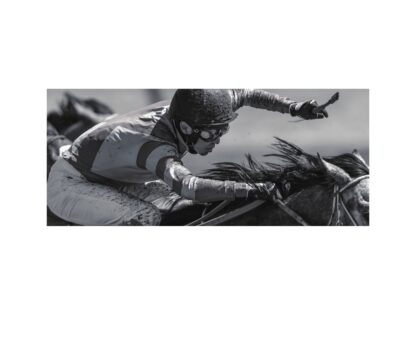 This section features photographs showcasing the main events from his childhood, time at the jockey school, his debut, and his current life.