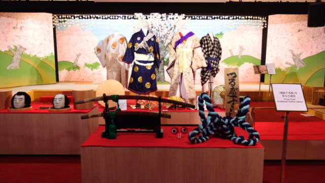 歌舞伎の知識も深まったところで、メインとなる歌舞伎座ホールの中へ足を踏み入れると、目の前に広がるのは、「本物」の舞台美術や、小道具、衣裳がギュッと詰まった『義経千本桜』の世界。舞台には十月歌舞伎座の第三部で上演される「吉野山」が再現され、その前には「すし屋」のいがみの権太、「吉野山」の忠信と静御前、そして「川連法眼館(四の切)」の源九郎狐の扮装が華やかに並びます。