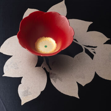野口洋子(漆芸)乾漆「蓬莱椿」 椿:径11.8×高さ5㎝、飾り台:縦36×横36×高さ1.2㎝