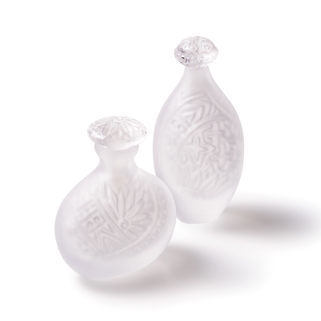 大谷佳子(ガラス)飾り瓶「空に花・命の器」(左から)縦6×横10×高さ12㎝、縦5×横7×高さ15㎝