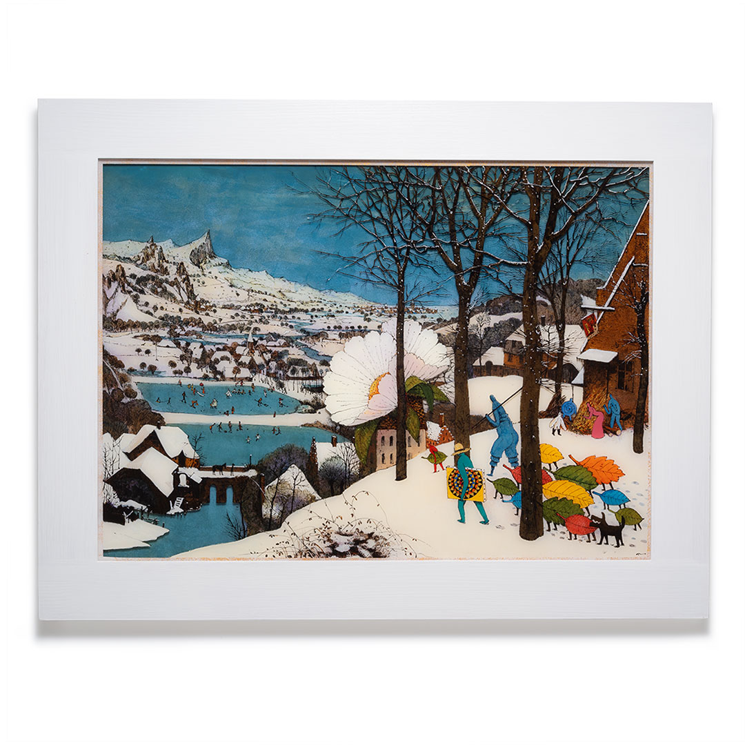 綿引明浩(絵画)「美しき人生・雪中の狩人」(額サイズ:縦45×横62㎝)