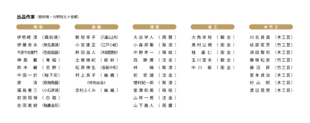 今回は陶芸、染織、漆芸、金工、木竹工の5つの工芸分野の中から40名の作品が出品されます。