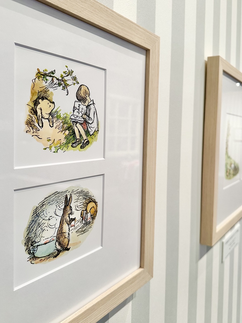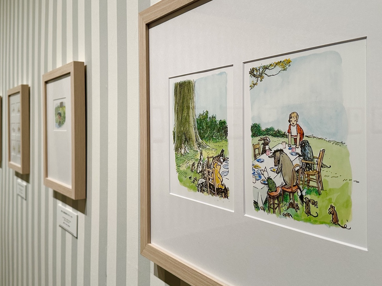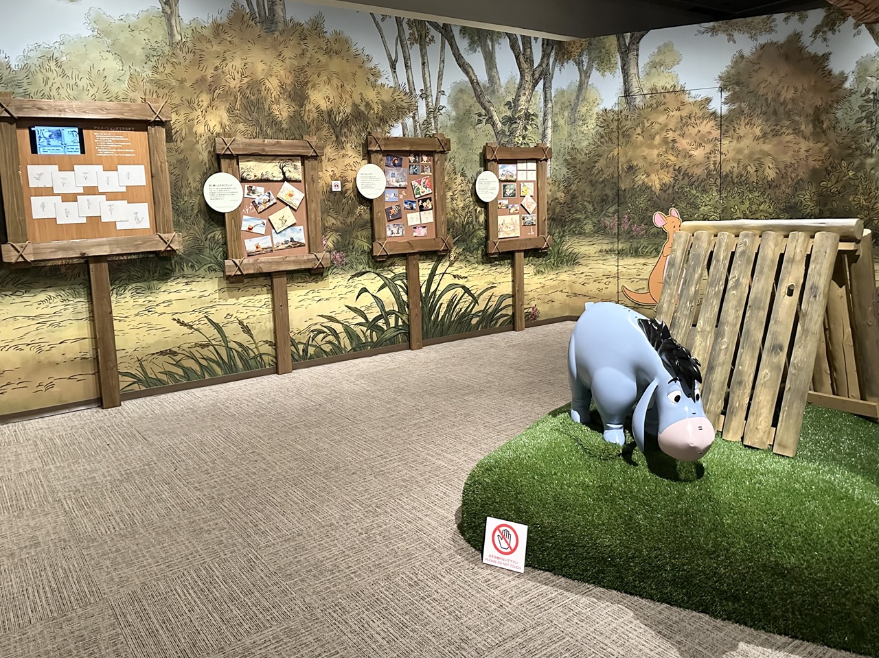 挿画のエリアでは、プーが穴にはまってしまった場面や、クリストファー・ロビンと夕日に向かってスキップする姿など、厳選された名シーンを堪能できます。