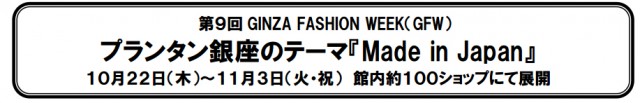 第9回 GINZA FASHION WEEK4店共通テーマ「GINZAを楽しもう」に基づき、プランタン銀座では独自テーマに『Made in Japan』を設け、約100ショップで展開いたします。外堀通りに面した有楽町に近…