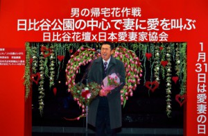 愛妻の日、1月31日を前に、1月29日(水)17時~、日比谷公園の大噴水前で、帰宅途中のサラリーマンなどの男性に、日頃言えない奥様への愛や感謝の言葉を叫び、愛妻の日テーマフラワー“チューリップ”の花束をプレゼントするイベ…