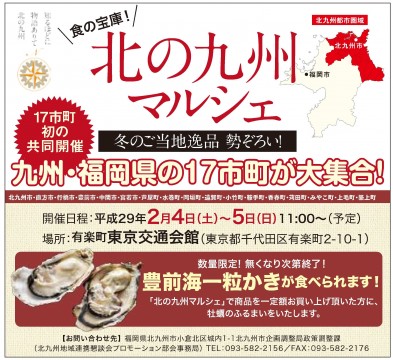 東京初開催!北九州市と近隣16市町の特産品が勢ぞろいしましたマルシェを開催します! 平成29年2月4日(土)・5日(日)11:00~17:00(予定) 東京交通会館(千代田区有楽町2-10-1)1階ピロティおよび 6階リ…
