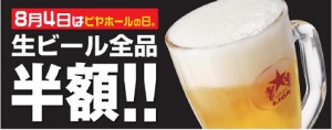 8月4日はビヤホールの日、生ビール全品半額セール!!