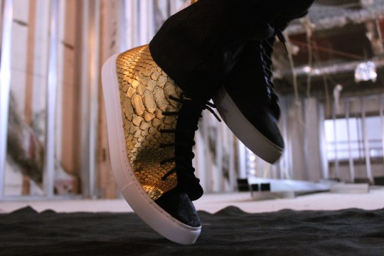 金箔スニーカー ¥1,200,000 日本の金閣寺と同様の箔を使用したスニーカー(1,200,000 円) や、YKK と2 年かけて共同開発した平面スタッズ付きのスニーカー(260,000 円) 京都の京…