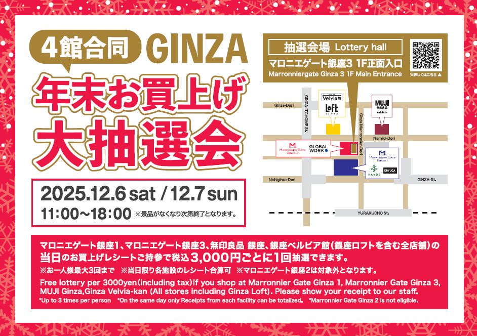 긴자의 상업 시설 「마로니에게이트 긴자 1」에서는, 12월 6일(토)·12월 7일(일)의 2일간, 연말 매입 대추첨회를 개최합니다. 꼭 이 기회에 발을 옮겨 주세요!