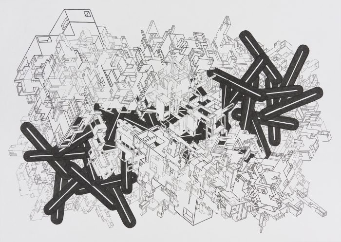 본전에서는, 복잡하게 겹치는 무기질인 거리의 구조안에, 「봉 형상의 물체」를 유기물의 상징으로서 겹쳐, 그 강도와 지속성을 표현했습니다. 빌딩과 빌딩의 얇은 골목을 걷고 문득 위를 올려다 보면 잘라낸 푸른 하늘을 흰 구름이 좌우로 흐릅니다. 시간과 공간의 압박으로부터 자신을 해방하는 것은 큰 도시의 한가운데라도 할 수 있다고 믿습니다. 본전이 사람으로서의 개성을 느낄 기회가 되면 다행입니다.