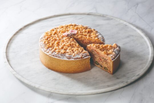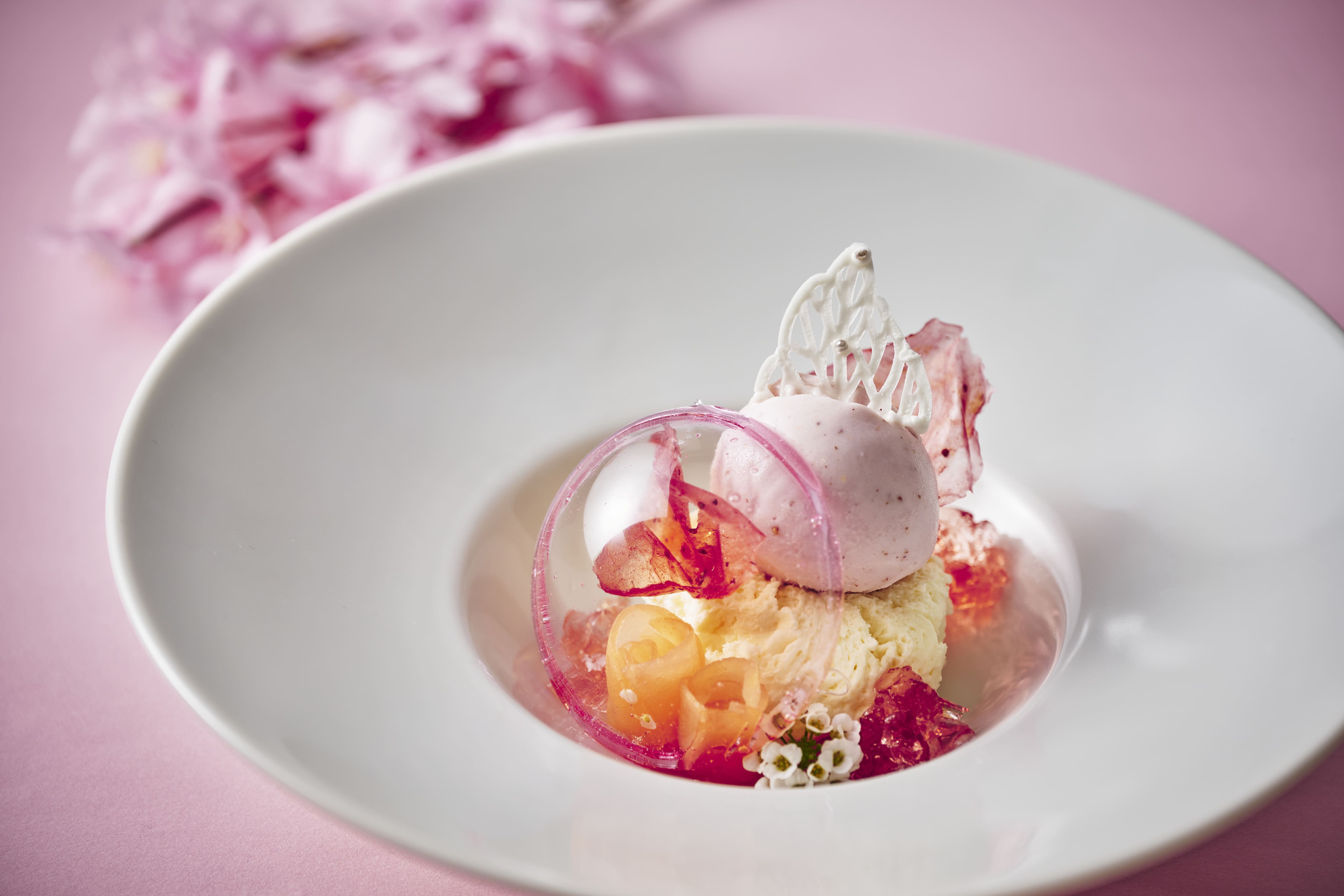 벚꽃의 풍부한 풍미를 맛볼 수 있는, 봄의 방문을 말하는 품위있는 맛의 타르트입니다. 벚꽃의 꽃잎과 잎의 소금 절임, 우구이스 콩을 더해 구워, 벚꽃색의 슈트로이젤과 벚꽃을 토핑했습니다.