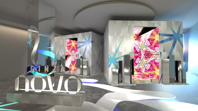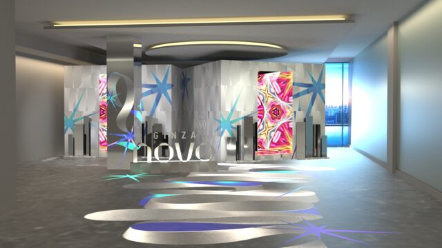本次活动将在三楼展出两个巨大的万花筒形装置,每个装置边长4米,高3.35米。由Ribbonesia创作的彩色丝带艺术作品以传统切割玻璃图案为主题,通过无限延伸的万花筒,表达了“GinzaNovo”——银座新象征——诞生的世界观,打造出独一无二的沉浸式体验装置。