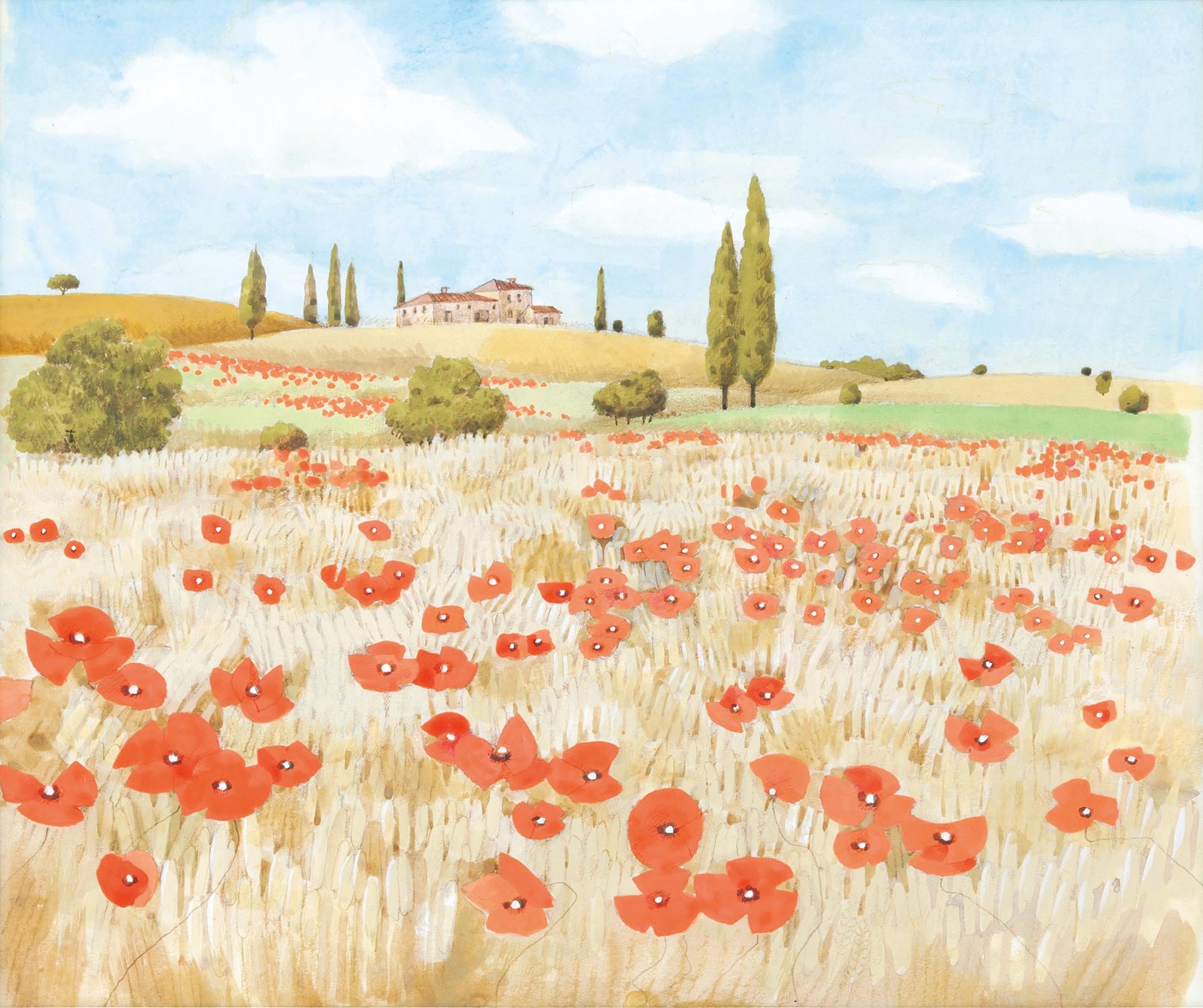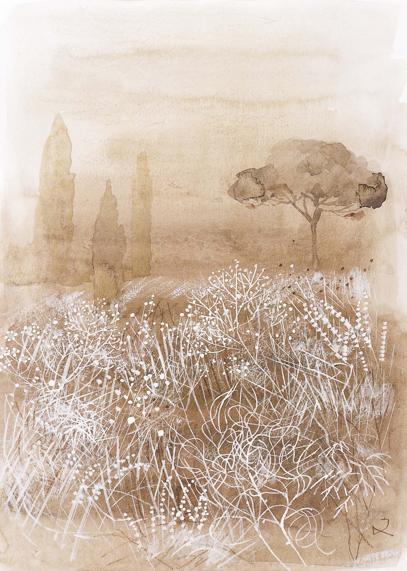 「托斯卡納鄉村野花盛開,麥田覆蓋著綿延的丘陵,橄欖樹林立,農舍如同山丘上的堡壘。森林、柏樹小徑,一切都像一個純樸的世界,讓人想起中世紀。我在日本飽經風霜的心在這裡得到了洗滌和重生。」(《冬青樹下》,堀文子著,元氣書房出版)