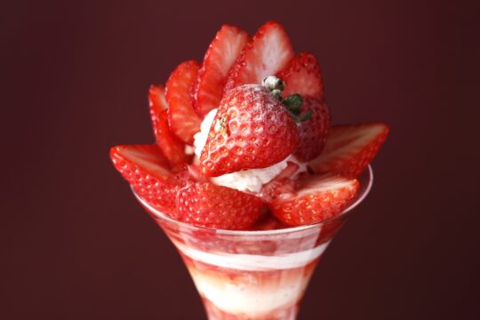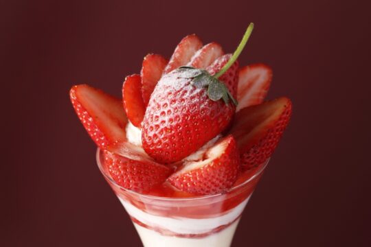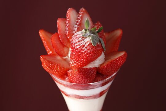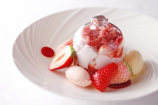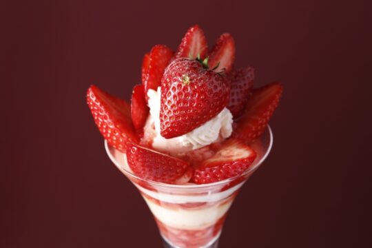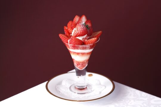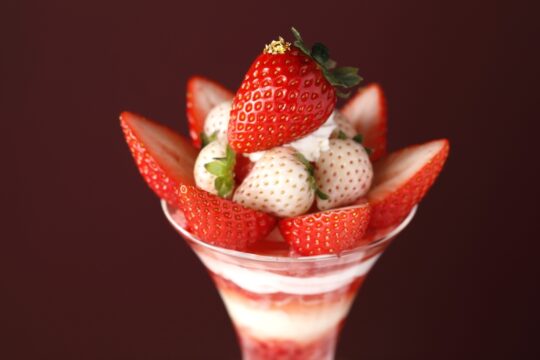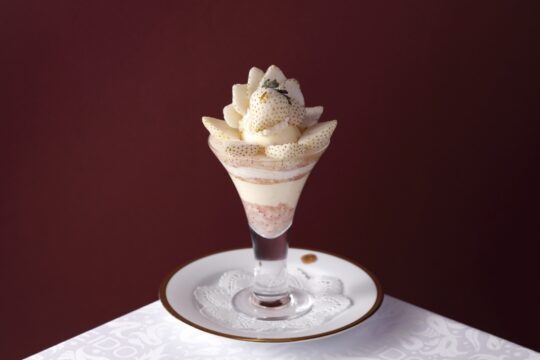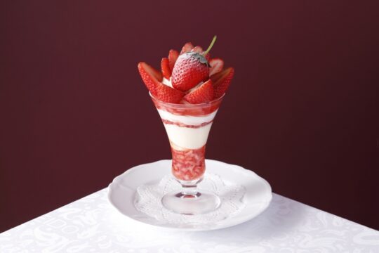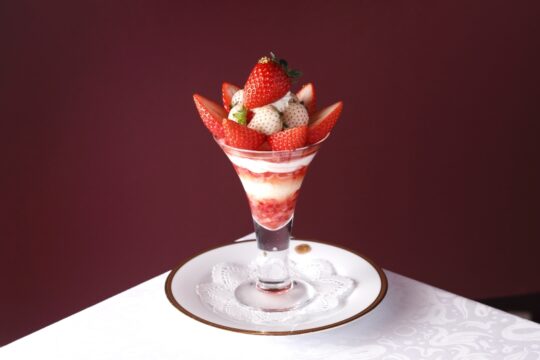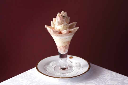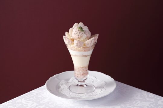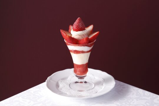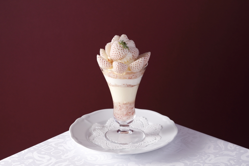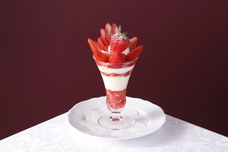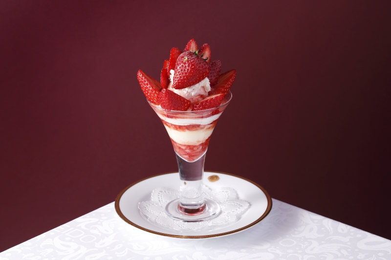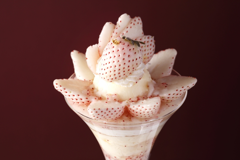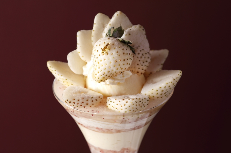 這款精美的芭菲選用兩種草莓精心製作而成:和歌山縣的“真理姬”草莓和佐賀縣的“天之雫”草莓。您可以盡情享用草莓杏仁豆腐和從杯中緩緩流出的醬汁,以及三種自製冰淇淋口味:香草、草莓和牛奶,感受它們帶來的和諧美味。