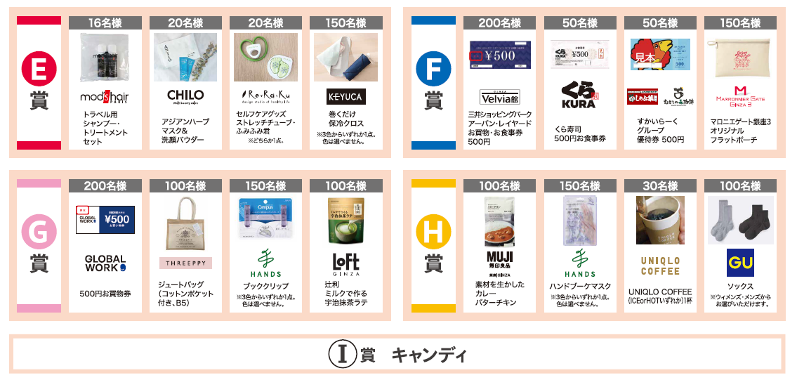 憑您在 Marronnier Gate Ginza 1、Marronnier Gate Ginza 2、Marronnier Gate Ginza 3、MUJI Ginza 或 Ginza Belvia Building(含 Ginza Loft 在內的所有店舖)的收據,當天每消費 3,000 日圓(含稅)即可獲得一次抽獎機會。